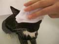 Cat taking Japanese style bath ( towel on head )