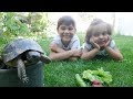 Fındık ailesi gerçek kaplumbağa ile oynuyor.