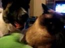 Akita dog fights Siamese Cat and loses!