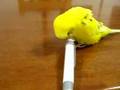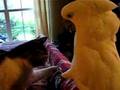 Parrot and cat play footsie