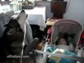 Wolf dog sings to a baby to stop his cry