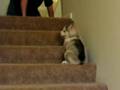 husky puppy goes up the stairs