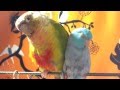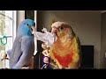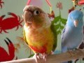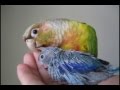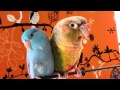 Conure being sweet with baby Parrotlets