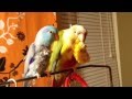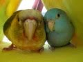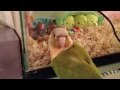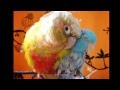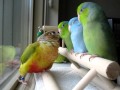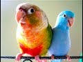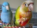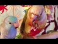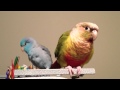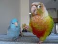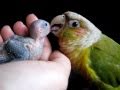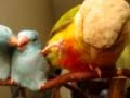 Conure being sweet with baby Parrotlets