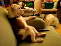 English Bulldog watching TV (Family Guy) sitting on a couch