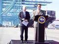 California Governor Arnold Schwarzenegger and United States Senator John McCain discuss greenhouse emissions against the backdrop of longshore workers discha...