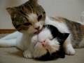 Cat mom hugs baby kitten