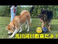 涼しくなったので仲良く荒川河川敷にやってきた、秋田犬そら・シェパード犬マック